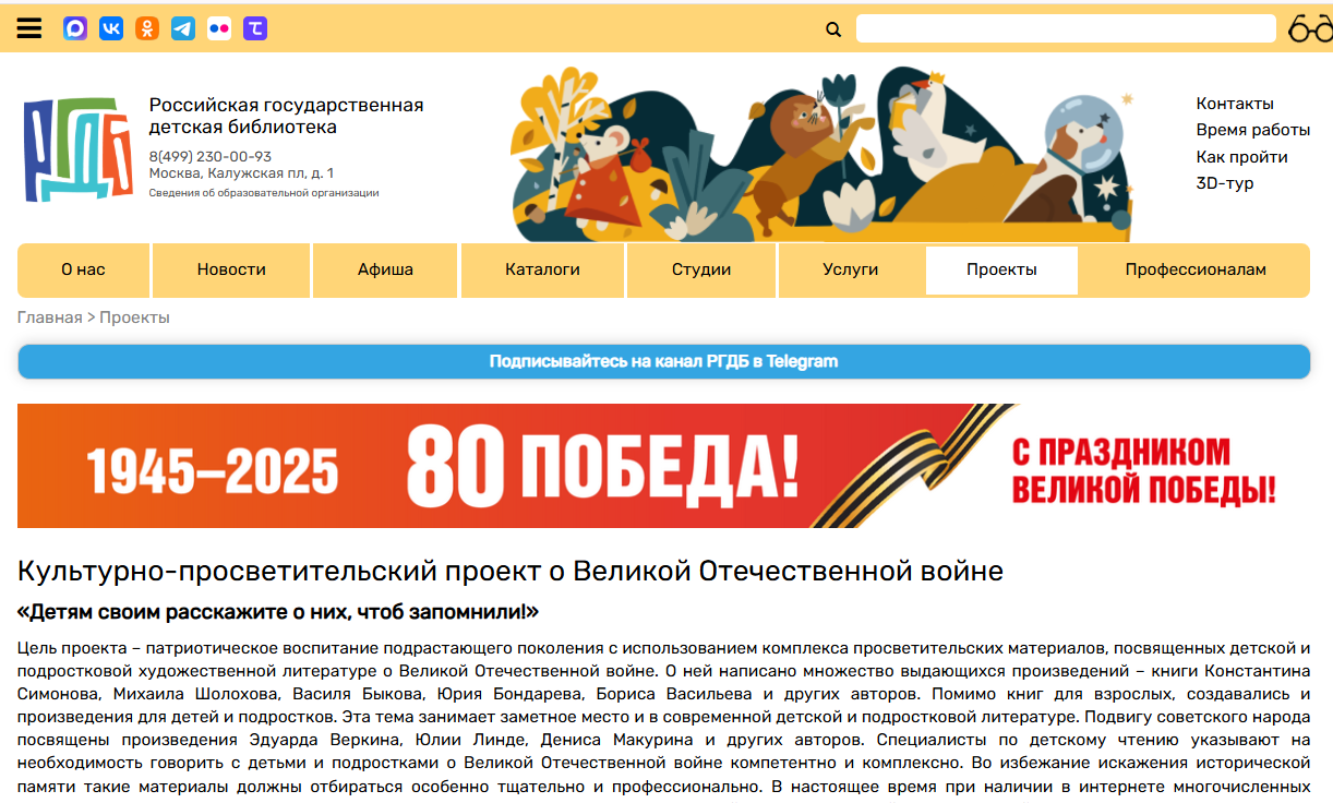 Российская государственная детская библиотека (РГДБ) разработала проект «Детям своим расскажите о них, чтоб запомнили!», направленный на патриотическое воспитание подрастающего поколения.