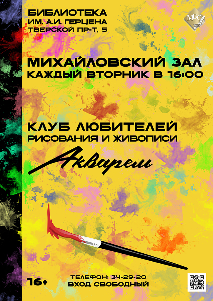 Каждый вторник в 16:00 в Михайловском зале Центральной городской библиотеки им. А.И. Герцена в рамках программы «Серебряный возраст» проходит заседание клуба любителей рисования и живописи «Акварель».