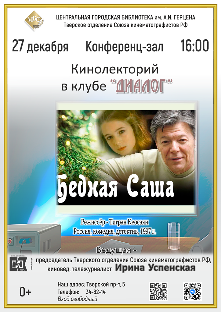 приглашает на кинолекторий по российскому комедийно-детективному художественному фильму 1997 года режиссёра Тиграна Кеосаяна — «Бедная Саша».