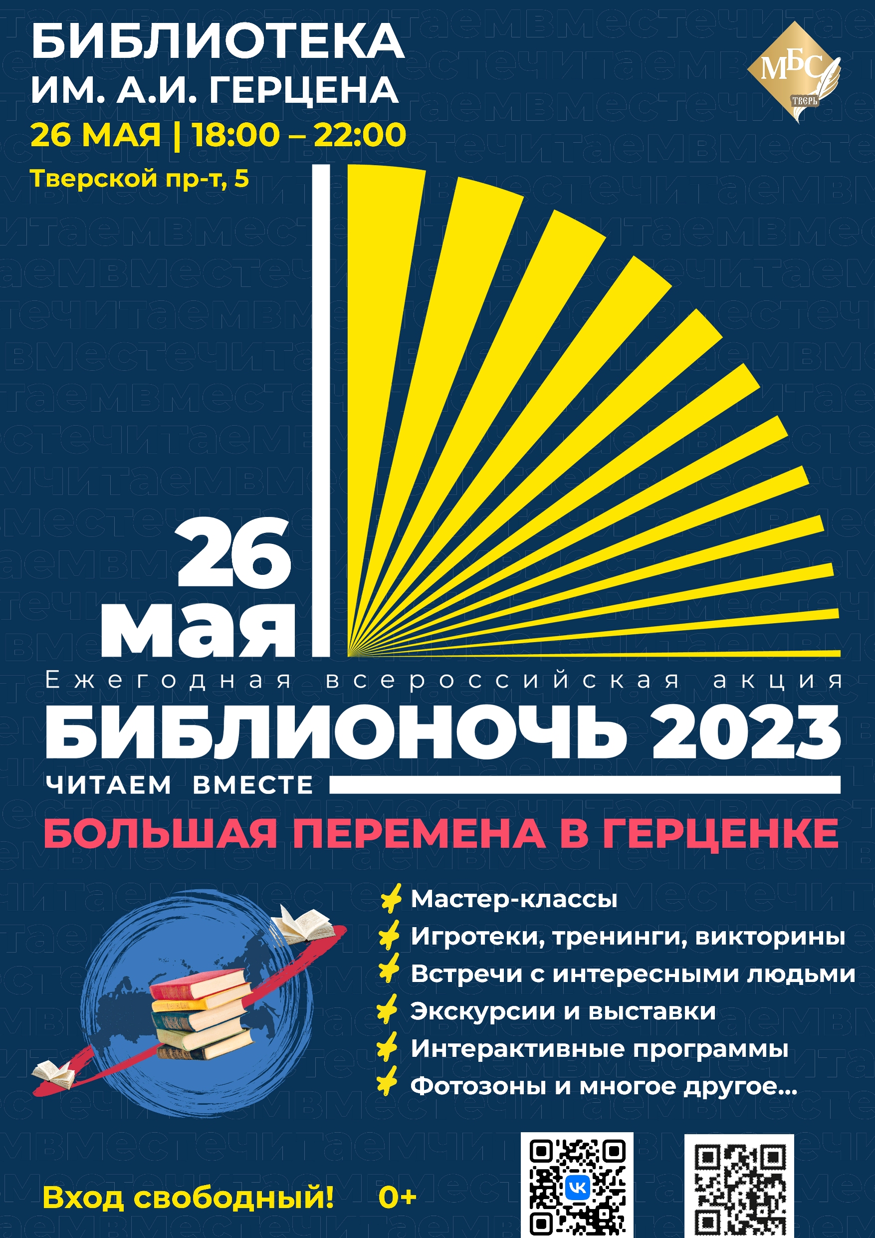 26 мая Центральная городская библиотека им. А.И. Герцена превратится в ШКОЛУ с яркими тематическими площадками. Праздничная программа «Большая перемена в Герценке» состоится в рамках ежегодной всероссийской акции в поддержку чтения «Библионочь» и будет посвящена Году педагога и наставника в России.