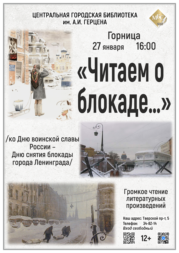 Уважаемые читатели! 27 января, в день полного освобождения Ленинграда от фашистской блокады, приглашаем вас в Центральную городскую библиотеку им. А.И. Герцена на громкое чтение литературных произведений «Читаем о блокаде…».