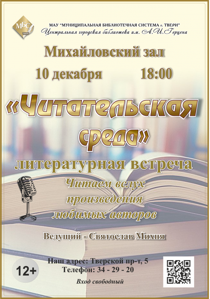 Друзья, приглашаем вас 10 декабря в Герценку на литературную встречу «Читательская среда». Участники вечера смогут прочитать вслух как стихи, так и рассказы своих любимых авторов. Вам понравилась книга, и вы хотите поделиться прочитанным? Тогда добро пожаловать в Михайловский зал Герценки. Каждый участник получает памятный приз!