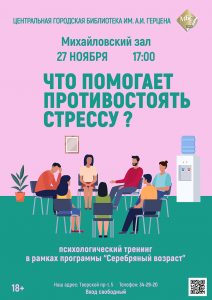 Друзья, в Михайловском зале Центральной городской библиотеки им. А.И. Герцена в рамках программы «Серебряный возраст» состоится психологический тренинг «Что помогает противостоять стрессу?».