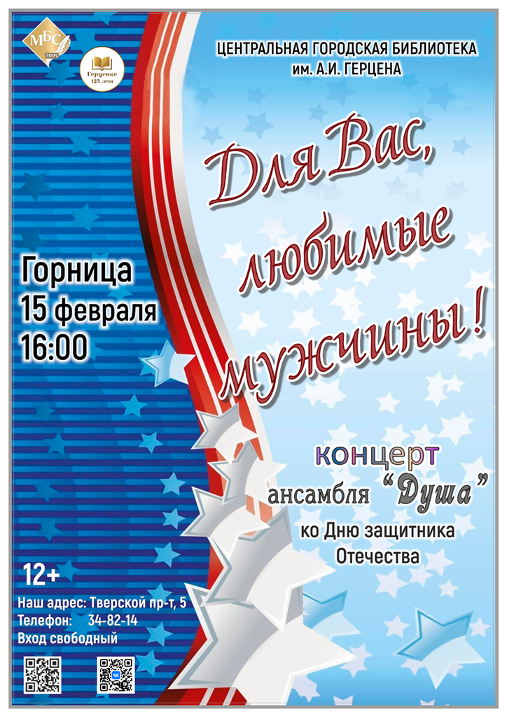 Дорогие друзья! Приглашаем вас на тёплый и душевный концерт «Для вас, любимые мужчины!» ансамбля «Душа», посвящённый Дню защитника Отечества!