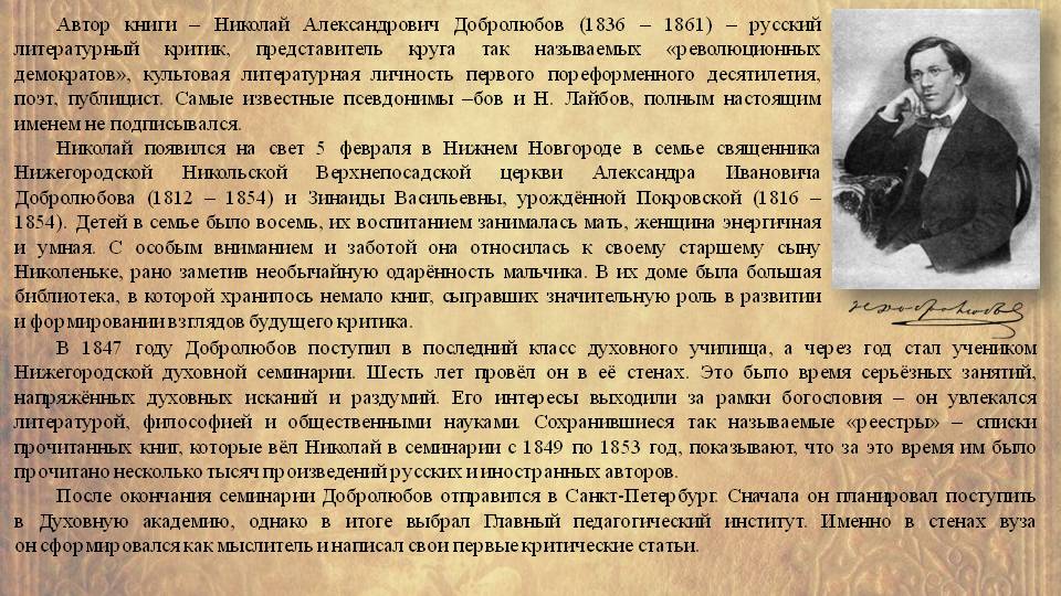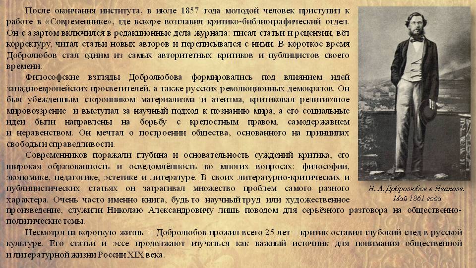 5 февраля 2026 года исполняется 190 лет со дня рождения Николая Александровича Добролюбова (1836 – 1861), замечательного русского литературного критика, публициста, поэта, педагога и философа, одного из самых ярких представителей российского революционно‑демократического движения середины XIX века, чьи творчество и идеи оказали значительное влияние на развитие общественной мысли в нашей стране.