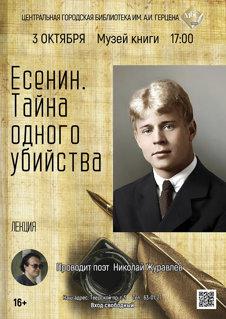Сергей Есенин. Ещё при жизни о нём ходило множество слухов и сплетен. Да и сам он своим характером добавлял поводов для различных обсуждений. Но до сих пор его смерть (или всё-таки гибель?) вызывает множество вопросов и обсуждений. И мы предлагаем всем желающим присоединиться к дискуссии о трагическом и загадочном уходе из жизни Сергея Есенина. Лекцию проводит поэт Николай Журавлёв.