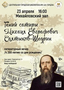 В Михайловском зале Центральной городской библиотеки имени А.И. Герцена 23 апреля в 16:00 состоится мероприятие, посвящённое Михаилу Евграфовичу Салтыкову-Щедрину, русскому писателю, одному из наиболее известных сатириков XIX века, журналисту, государственному деятелю.
