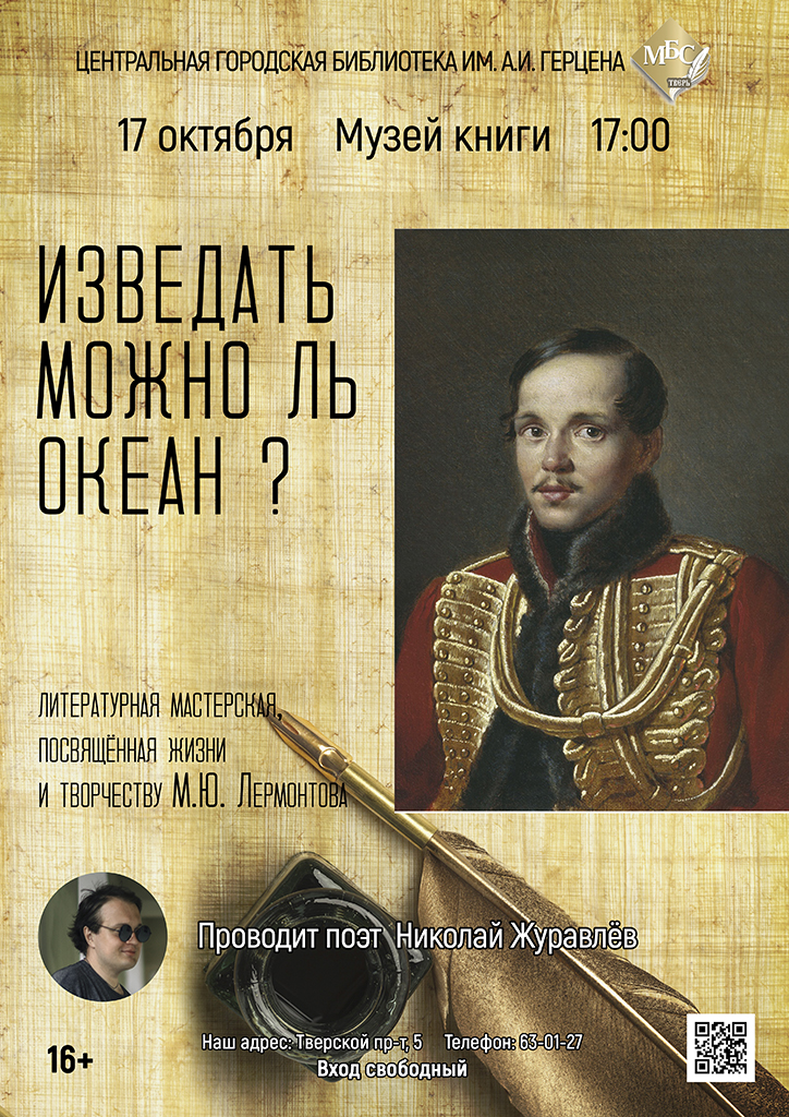 «Я был готов любить весь мир, — меня никто не понял: и я выучился ненавидеть. Моя бесцветная молодость протекала в борьбе с собой и светом; лучшие мои чувства, боясь насмешки, я хоронил в глубине сердца: они там и умерли», — эти слова Печорина из романа «Герой нашего времени» в полной мере относятся и к автору данного произведения. Пожалуй, в русской литературе нет более непонятой личности, чем Михаил Юрьевич Лермонтов. Горделивый, заносчивый, язвительный — таким он запомнился большинству современников. Но что на самом деле творилось на душе у поэта? Узнать об этом вы сможете на литературной мастерской «Изведать можно ль океан?».