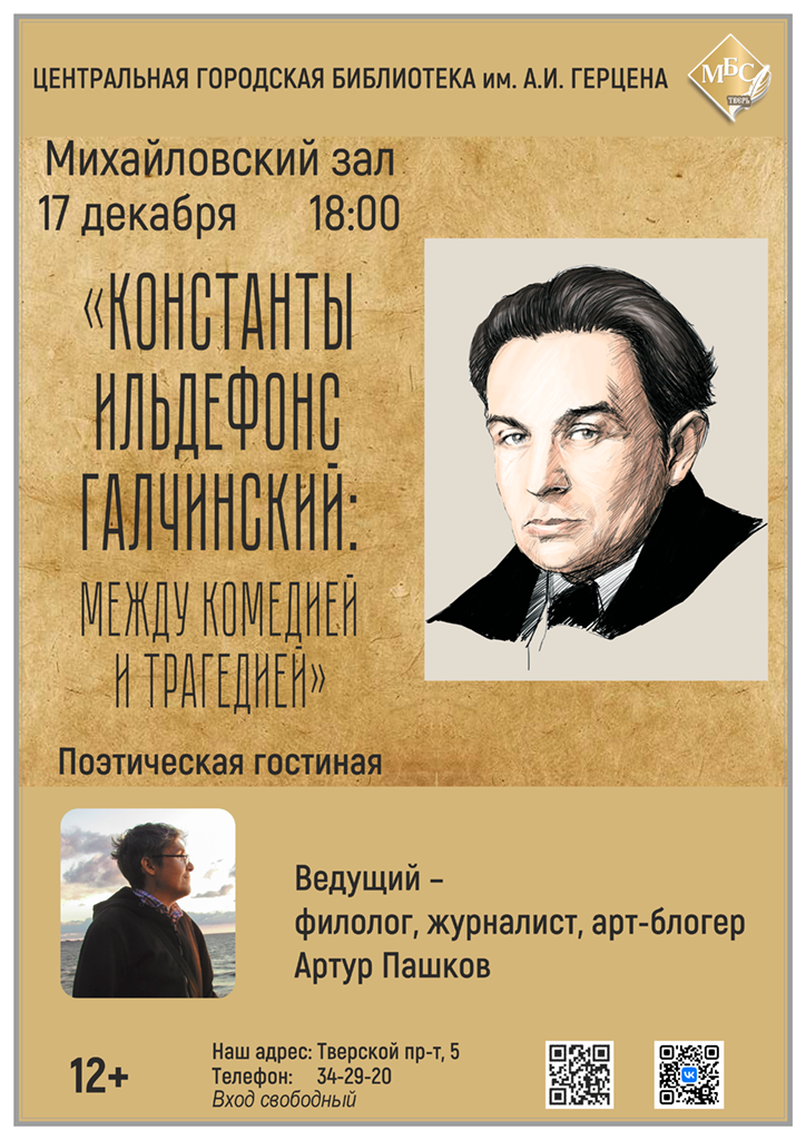 17 декабря в поэтической гостиной Герценки пройдёт лекция Артура Пашкова «Между комедией и трагедией», посвящённая Константы Ильдефонсу Галчинскому. Имя у этого поэта было редкое, музыкальное, даже какое-то сказочное. И сам он десятилетиями прятался от страшной действительности в мир поэзии, выдумки, шутки. Галчинский любил спрашивать у прохожих на улице: «Простите, я правильно иду?» На вопрос, куда ему надо, поэт указывал прямо перед собой: «Туда!» Он действительно шёл вперед с улыбкой, через собственное отчаяние, войны и человеческую жестокость. Испытав в жизни многое, Галчинский выразил свой символ веры в нескольких словах: «Во тьме у человека лишь одна обязанность – светить».