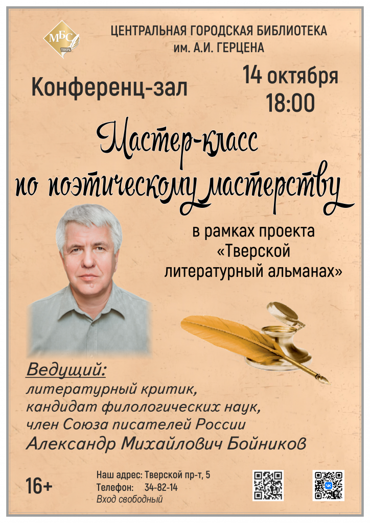 14 октября в Центральной городской библиотеке им. А.И. Герцена в рамках проекта «Тверской литературный альманах» состоится первый мастер-класс по поэтическому мастерству. Встречу проведёт известный литературный критик, кандидат филологических наук, член Союза писателей России Александр Михайлович Бойников.
