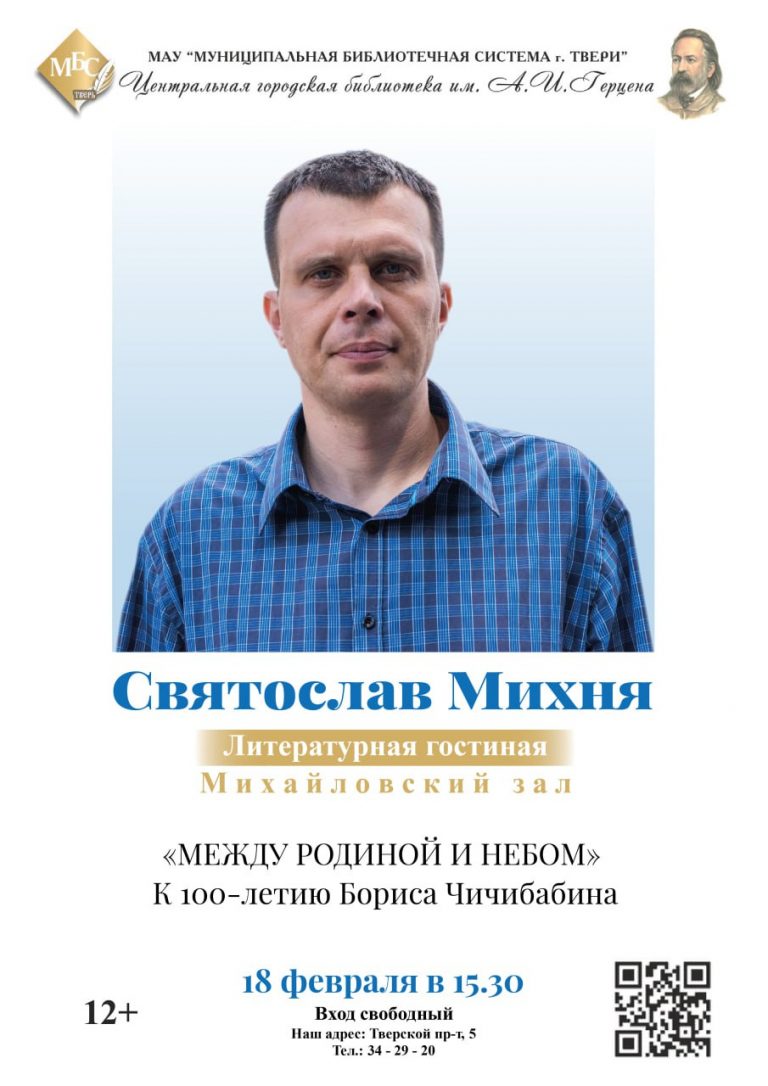 Дорогие читатели! В нашей библиотеке в рамках литературного краеведческого проекта «Эта земля твоя и моя» состоится лекция «Между родиной и небом» известного тверского поэта и журналиста Святослава Михни. Она будет посвящена 100-летию со дня рождения русского поэта, лауреата Государственной премии СССР Бориса Чичибабина (Полушина). Стихи Бориса Алексеевича о русской истории, о русской словесности, мировой культуре включены в антологию русской поэзии.