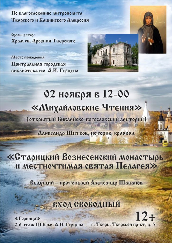 Друзья, приглашаем вас в Герценку на лекцию «Старицкий Вознесенский монастырь и местночтимая Пелагея» в рамках открытого Библейско-богословского лектория «Михайловские чтения».