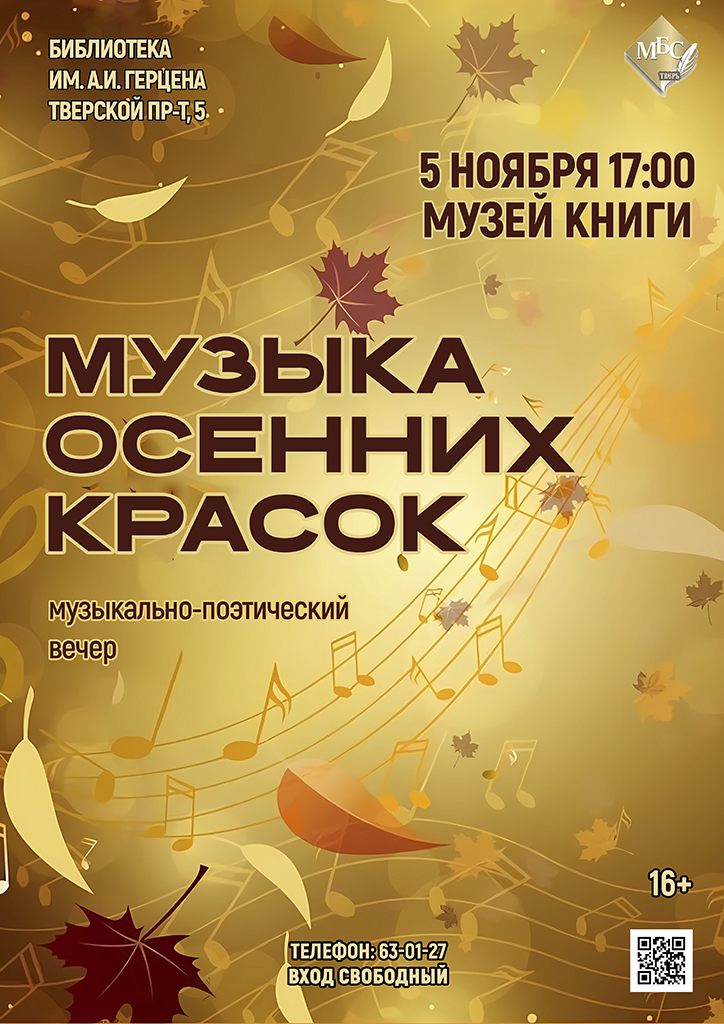 Есть у осени особая музыка. Нотами из жёлтых листьев сплетается песня сонных деревьев, рыжего солнца и холодного ветра. В такое время хочется чего-то лирического: душевных стихов, музыки, фильмов. Друзья, предлагаем вам окунуться в это, по-своему чудесное, осеннее настроение на музыкально-поэтическом вечере в Музее книги.