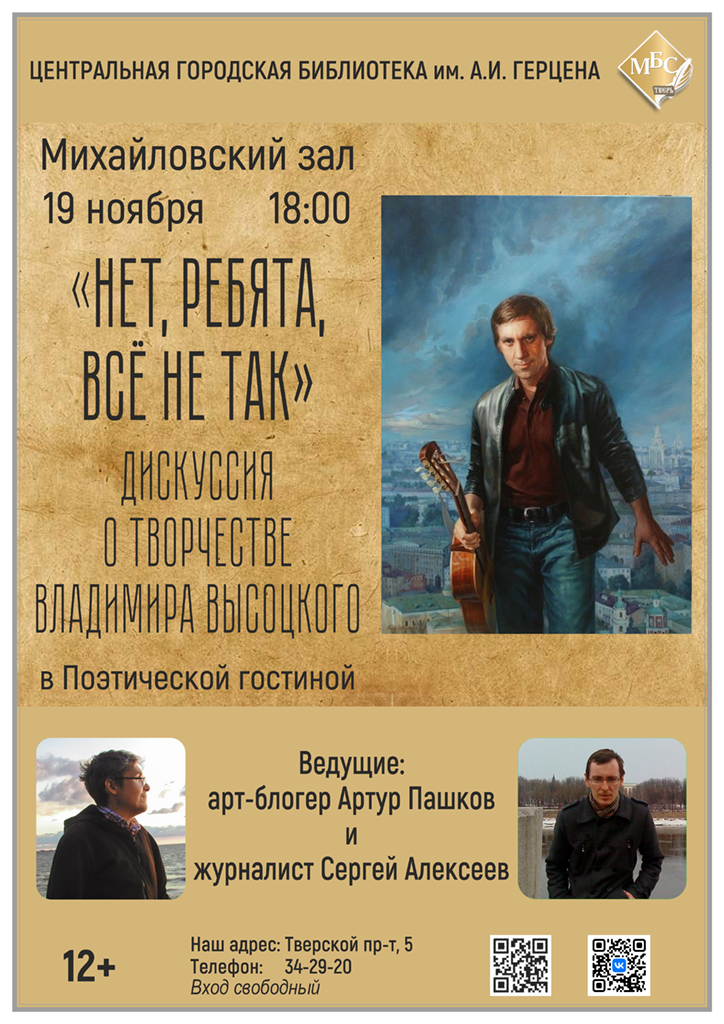 Журналист Сергей Алексеев и арт-блогер Артур Пашков встретятся в открытом споре и попытаются разобраться, что же такое поэзия Высоцкого, насколько в состоянии она преодолеть «инерцию аккомпанемента» и существовать отдельно от гитарных переборов и неповторимого тембра голоса Владимира Семёновича. А главное, в чём величие уникального автора, говорившего голосом самых разных персонажей – от сбитого истребителя до алкоголиков в вытрезвителе.