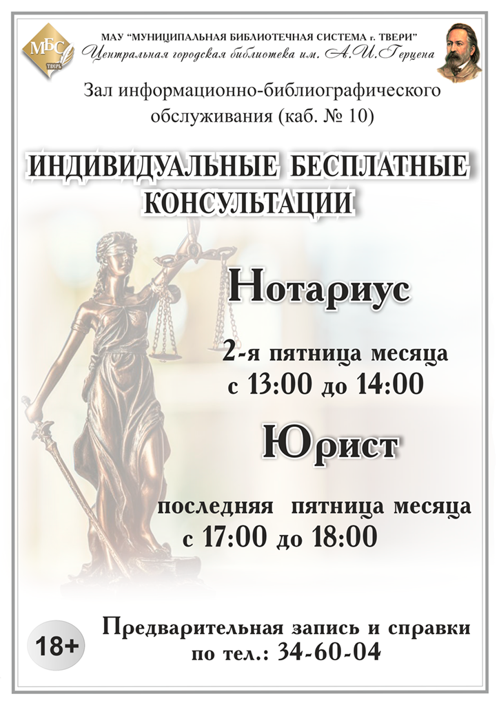Друзья! Центр правовой и социальной информации Центральной городской библиотеки им. А.И. Герцена приглашает всех желающих на бесплатные индивидуальные консультации нотариуса, которые состоятся