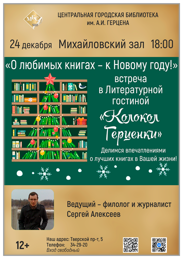 Посетители Литературной гостиной «Колокол Герценки» посвятят предновогоднюю встречу рассказам о любимых книгах нашего детства, юности и зрелости. Все желающие смогут рассказать о понравившихся книгах, и взять на карандаш советы, рекомендации, истории опытных и не очень книгочеев.