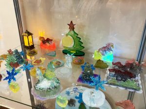 Автор выступила в роли экскурсовода и познакомила слушателей с тремя тематическими экспозициями: «Тысячелетние славянские обереги», «Море в подарок», «Готовимся к встрече Нового года», отметив, что эпоксидная смола является уникальным материалом для творчества. Встречу украсила живая музыка.