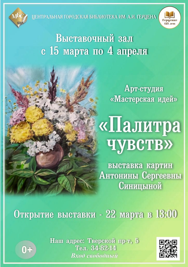 Приглашаем вас погрузиться в удивительный мир живописи: с 15 марта по 4 апреля в Герценке пройдёт выставка «Палитра чувств» талантливой художницы Антонины Сергеевны Синицыной.