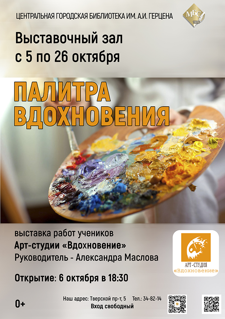 «Арт-студия «Вдохновение» — это студия рисования для взрослых и детей в Твери. Мы помогаем раскрыть таланты, используя различные техники и многообразие изобразительных материалов».