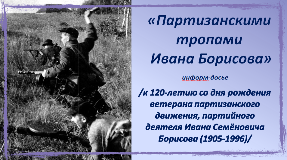 Предлагаем вашему вниманию информ-досье «Партизанскими тропами Ивана Борисова», посвящённое жизни и боевому пути Ивана Семёновича.