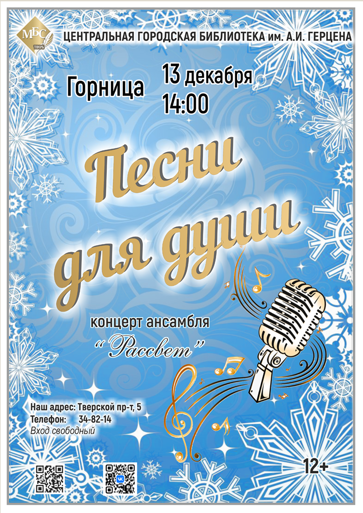 Дорогие друзья, Центральная городская библиотека им. А.И. Герцена и ансамбль «Рассвет» приглашают всех желающих на концертную программу «Песни для души».