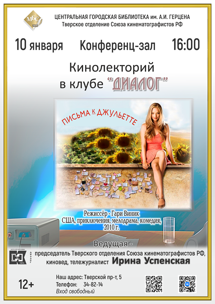 приглашает на кинолекторий по романтической американской комедии режиссёра Гарри Виника — «Письма к Джульетте»(2010 г.).