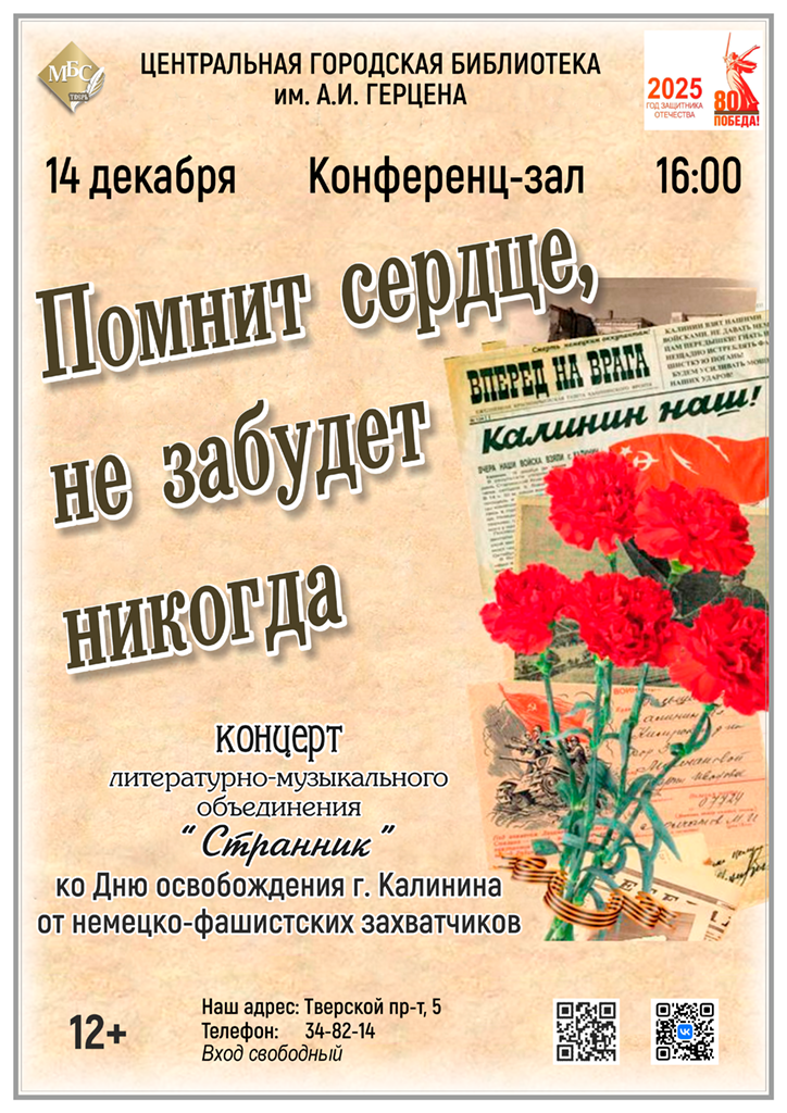 Дорогие читатели! 14 декабря приглашаем вас на концерт ко Дню освобождения г. Калинина от немецко-фашистских захватчиков «Помнит сердце, не забудет никогда» литературно-музыкального объединения «Странник».