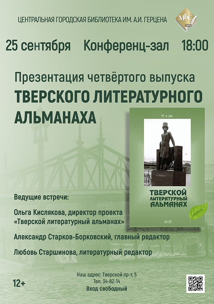Тверской литературный альманах приглашает всех своих друзей — читателей, авторов и всех желающих — на презентацию очередного, 4-го выпуска Тверского литературного альманаха. Будем читать стихи и прозу, слушать (и петь!) песни на стихи тверских поэтов, делиться творческими планами…