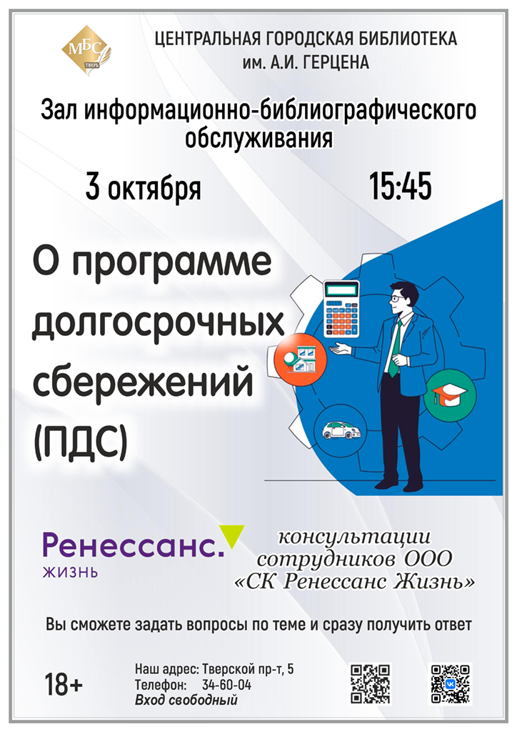 Уважаемые друзья! 3 октября сотрудники ООО «СК Ренессанс Жизнь» проведут в Центральной городской библиотеке им. А.И. Герцена консультацию на тему «Программа долгосрочных сбережений (ПДС)».