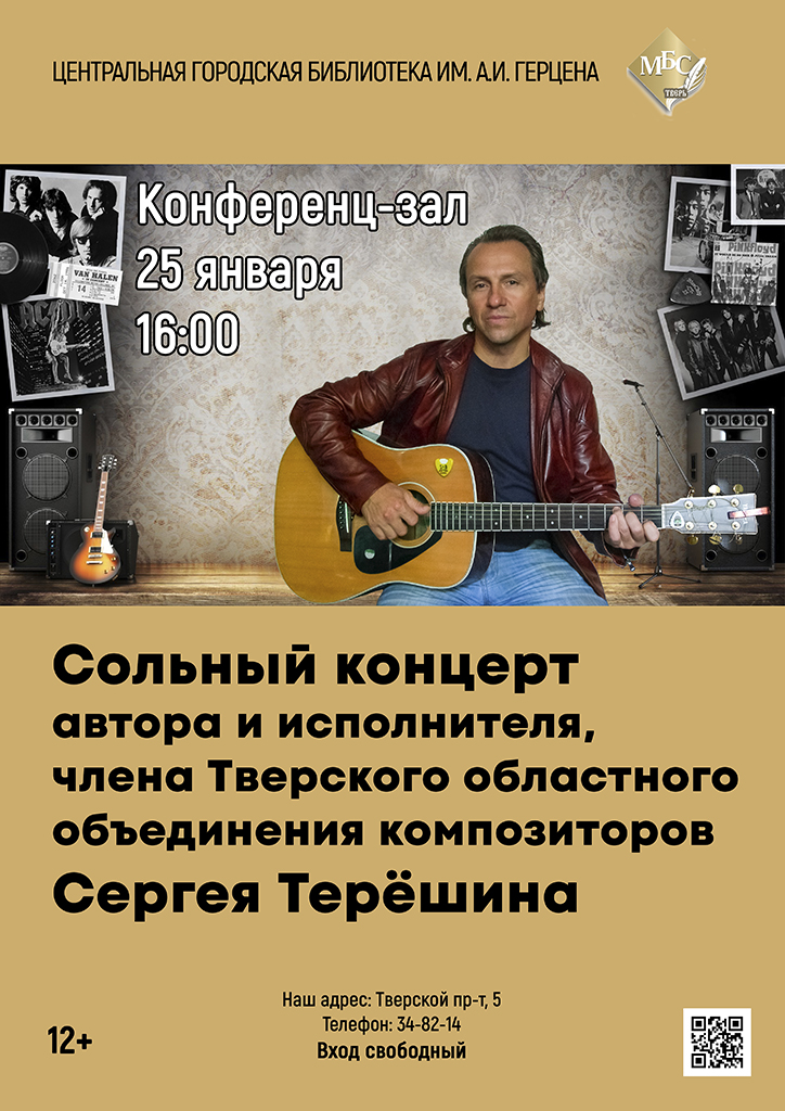 Друзья, приглашаем вас в Центральную городскую библиотеку им. А.И. Герцена на сольный концерт автора и исполнителя, члена Тверского областного объединения композиторов, участника литературно-музыкального объединения «Странник» — Сергея Терёшина.