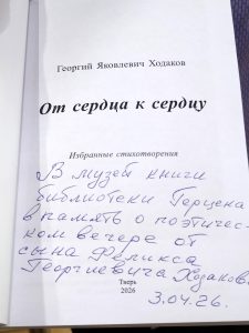 Кроме того, к 125-летию со дня рождения учителя и поэта в рамках поэтического вечера состоялась первая презентация собрания избранных стихотворений Г.Я. Ходакова «От сердца к сердцу».