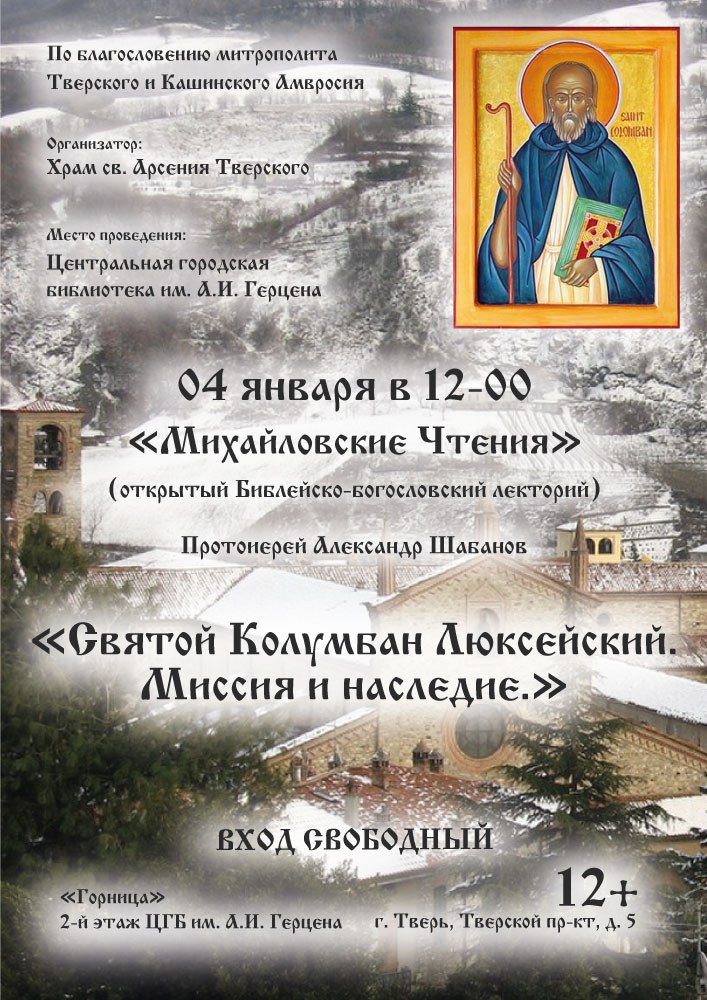 Друзья, приглашаем вас в Герценку на лекцию «Святой Колумбан Люксейский. Миссия и наследие» в рамках открытого Библейско-богословского лектория «Михайловские чтения».