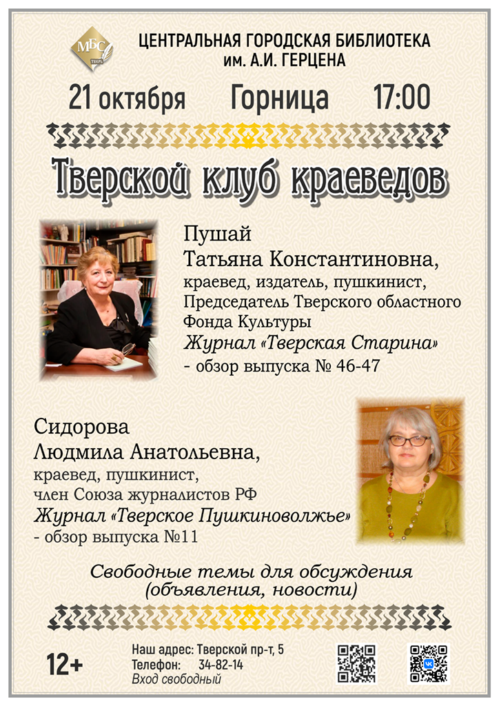 Тверской клуб краеведов приглашает на открытое заседание, на котором исследователи и любители истории Тверской земли смогут услышать и обсудить предложенные темы.