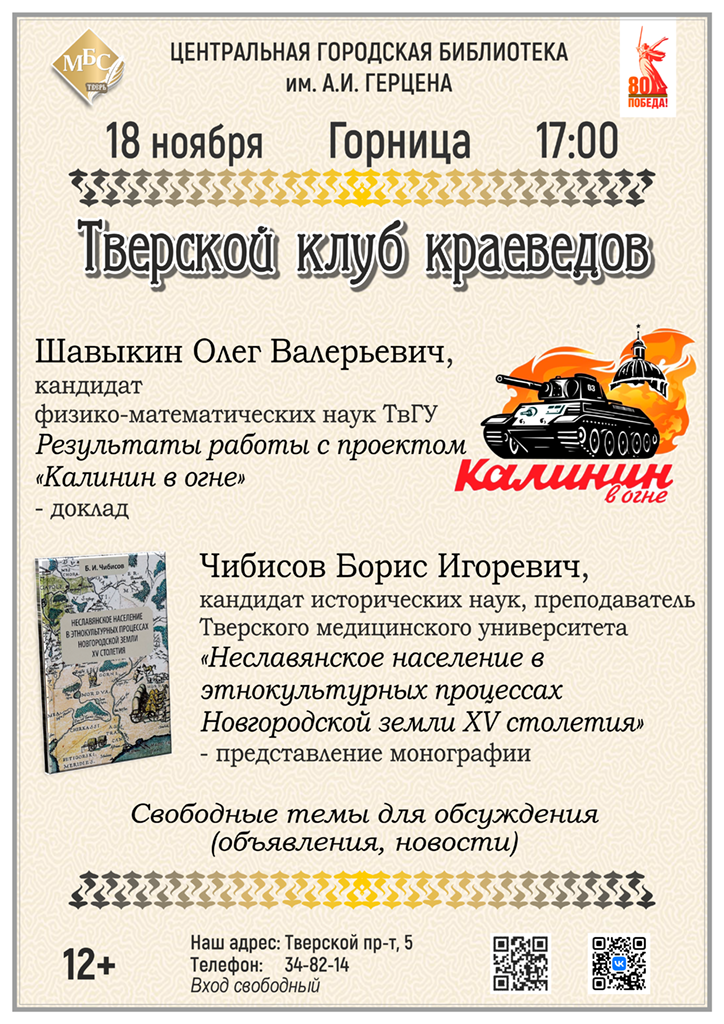 Тверской клуб краеведов приглашает на открытое заседание, на котором исследователи и любители истории Тверской земли смогут услышать и обсудить предложенные темы.