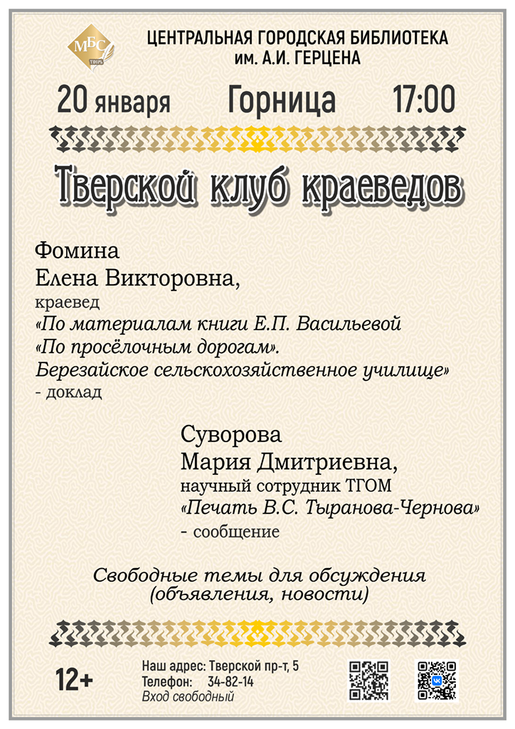 Тверской клуб краеведов приглашает на открытое заседание, на котором исследователи и любители истории Тверской земли смогут услышать и обсудить предложенные темы.