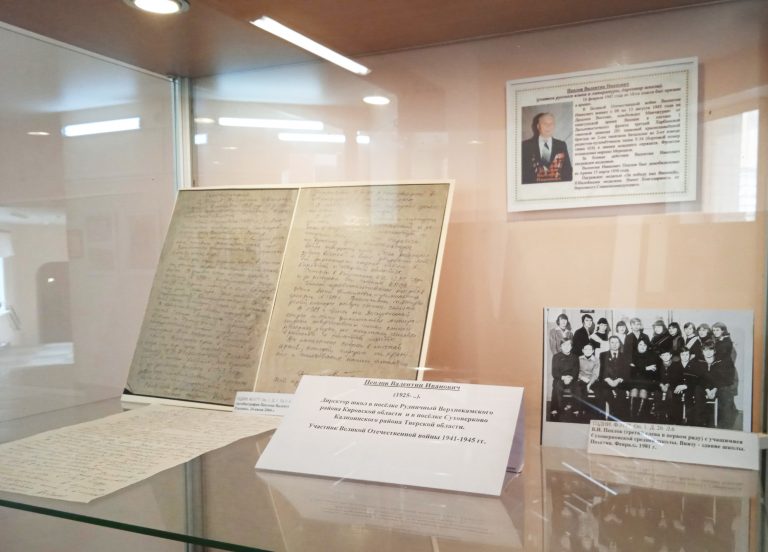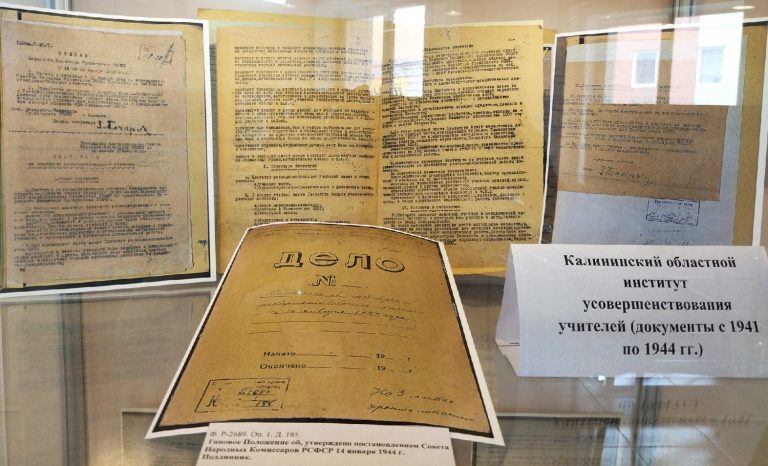 В состав экспозиции вошли управленческие документы за 1942-1944 гг. из архивного фонда Калининского института усовершенствования учителей, личные документы его руководителей — Арсения Петровича Сербского и Тимофея Прокофьевича Пышнова, а также документы педагогов-участников Великой Отечественной войны 1941-1945 гг. — Александра Ильича Красикова и Валентина Ивановича Пеплова.