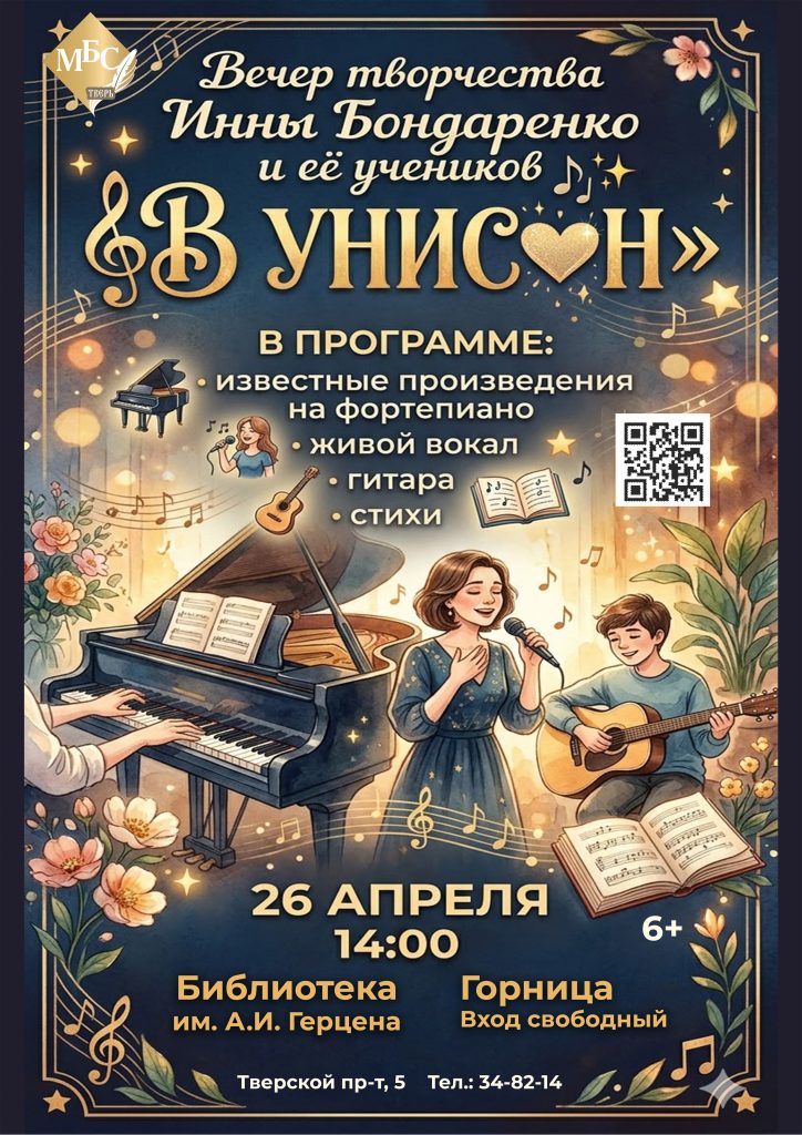 Дорогие друзья, приглашаем вас окунуться в удивительный мир музыки и поэзии. Юные музыканты исполнят для вас на фортепиано произведения известных композиторов, вы услышите проникновенные песни в исполнении начинающих артистов, гитарные композиции, душевные стихи, наполненные глубоким смыслом.