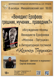 8 октября приглашаем на встречу в Литературной гостиной «Колокол Герценки». Осенний сезон продолжается обсуждением поэмы Венедикта Ерофеева «Москва – Петушки».